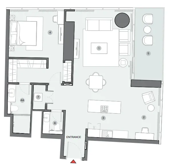 Extra large format Porcelain tile. Pre-Engineered timber flooring. Contemporary & stylish Carpet. Veneer finished solid core tall & elegant doors. Marble & Solid surface counter tops. Doubly Glazed Floor to Ceiling glass curtain wall. Leatherette & rich veneer finished wardrobes. Clear heights of 3 meters in Living areas. Smart Home automation enabled. State-of-art home appliances. Elegant Single slot diffusers. Flexi track lighting.