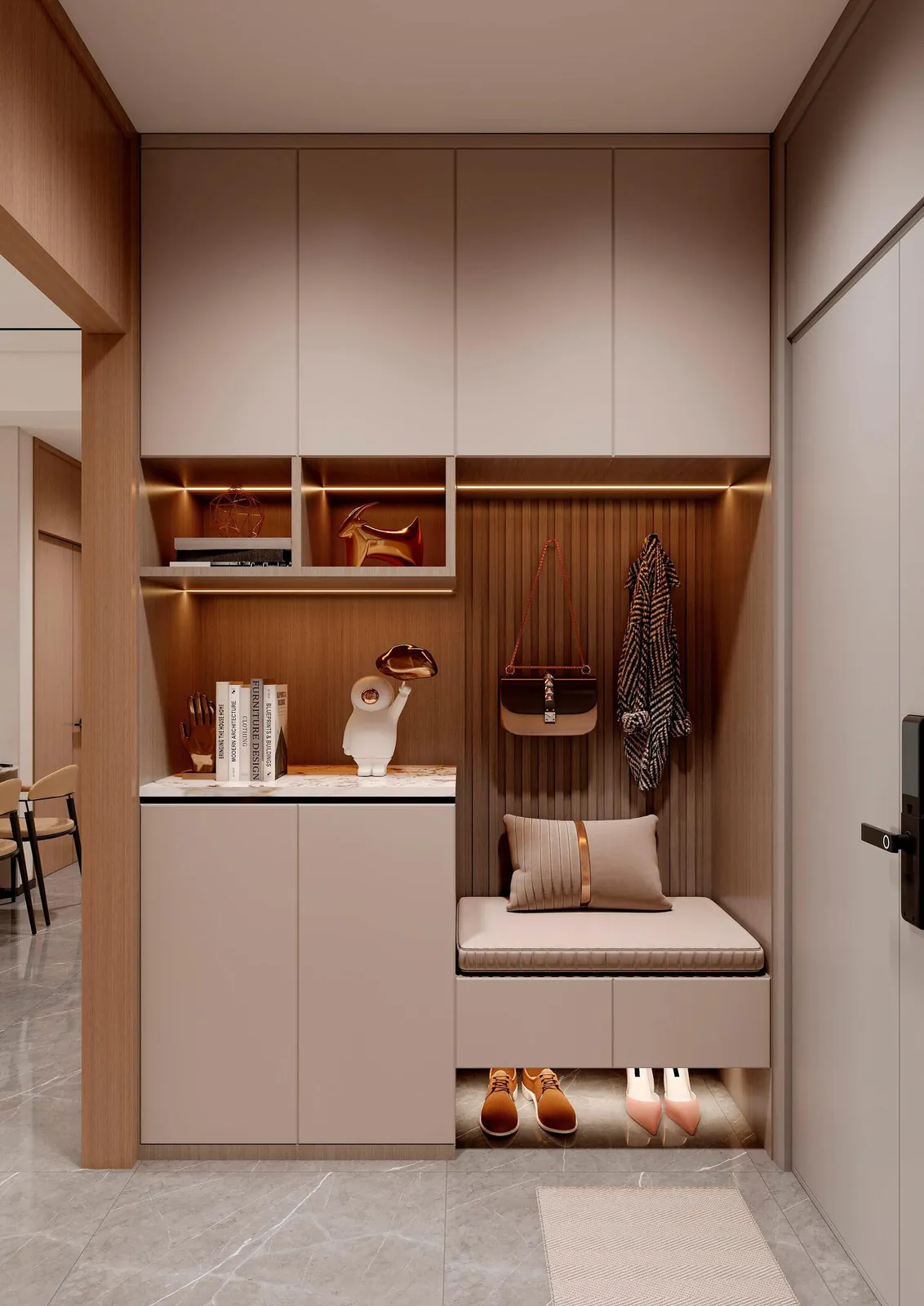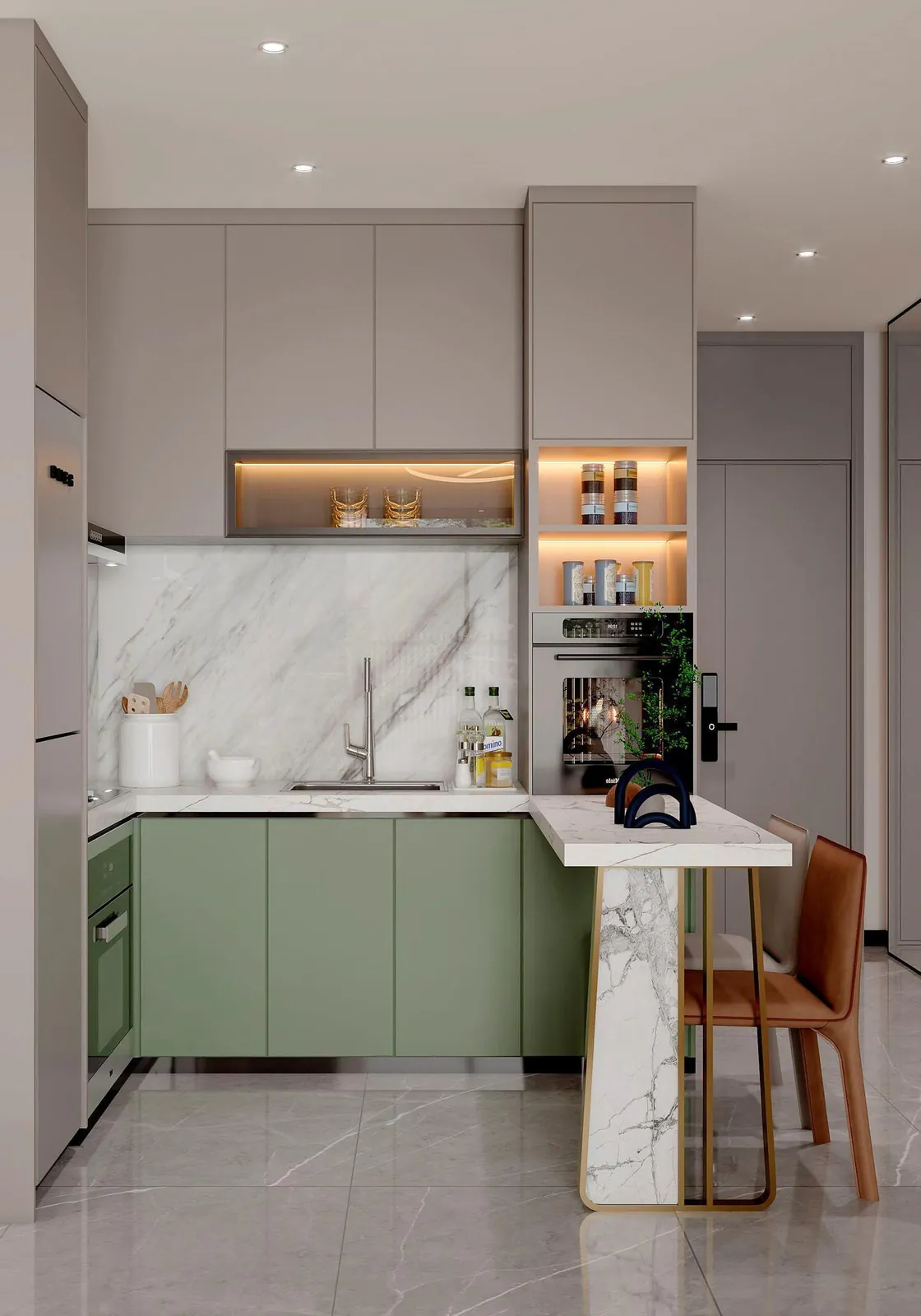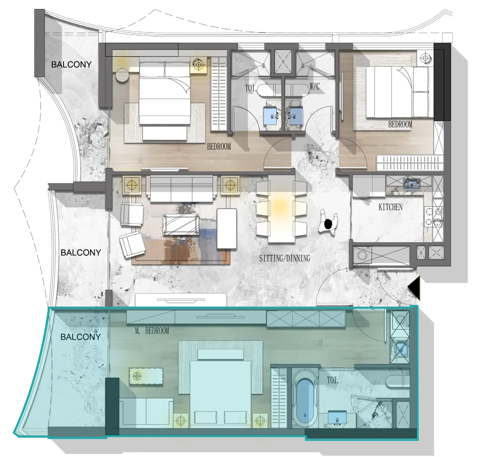 The design of the building emphasizes modernity and flexibility. Select 2-bedroom and 3-bedroom apartments are configured to allow separation into independent living spaces, such as a 1-bedroom and studio, or a 2-bedroom and studio. This modular approach allows for adaptable use of space, catering to diverse residential needs while maintaining a cohesive design language throughout the project.
