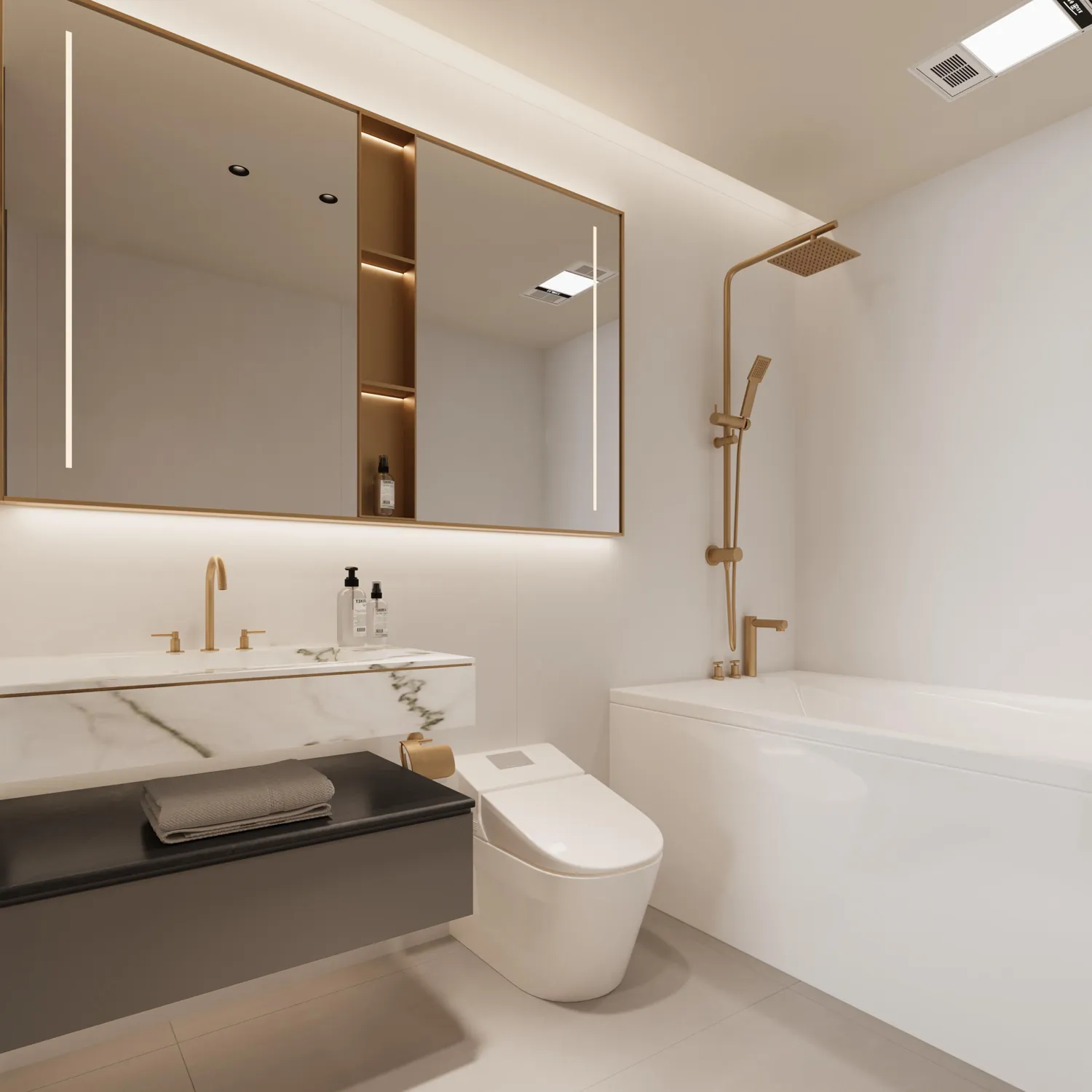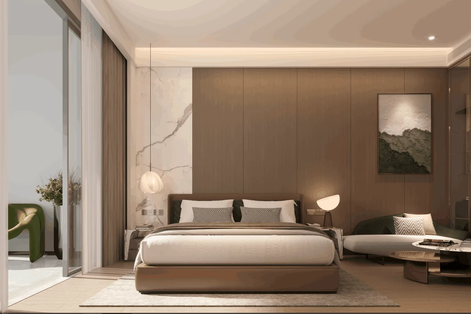 The project features modern, high-quality finishes, including rock slabs and stone materials, stainless steel accents, wooden veneer, and artistic paint, creating a refined and elegant atmosphere. The project is equipped with a smart home system.