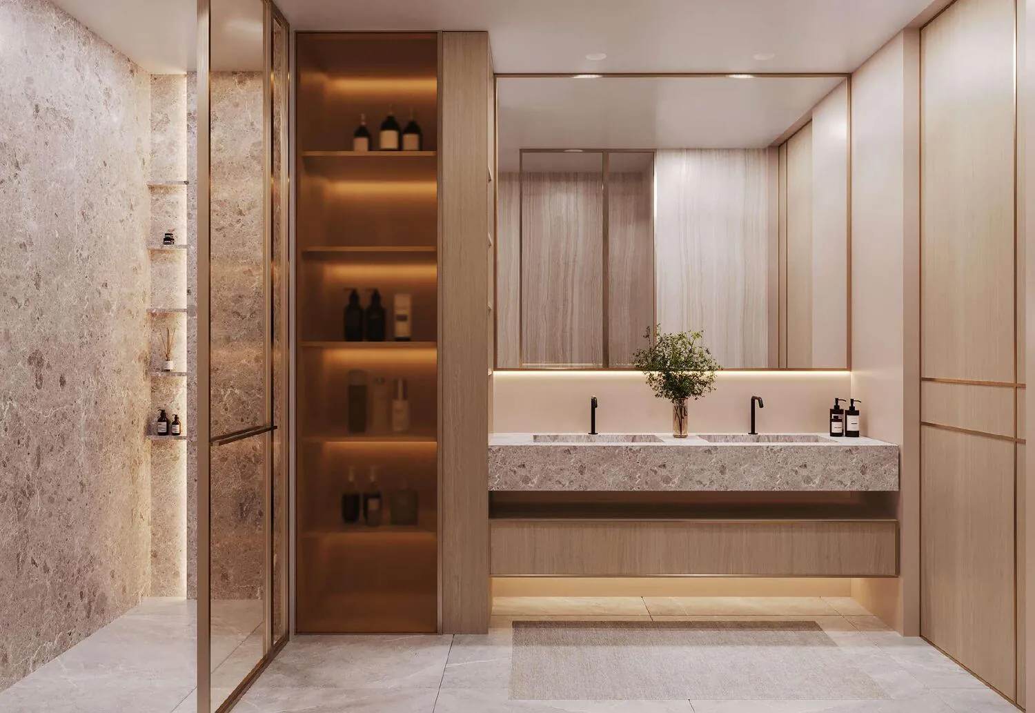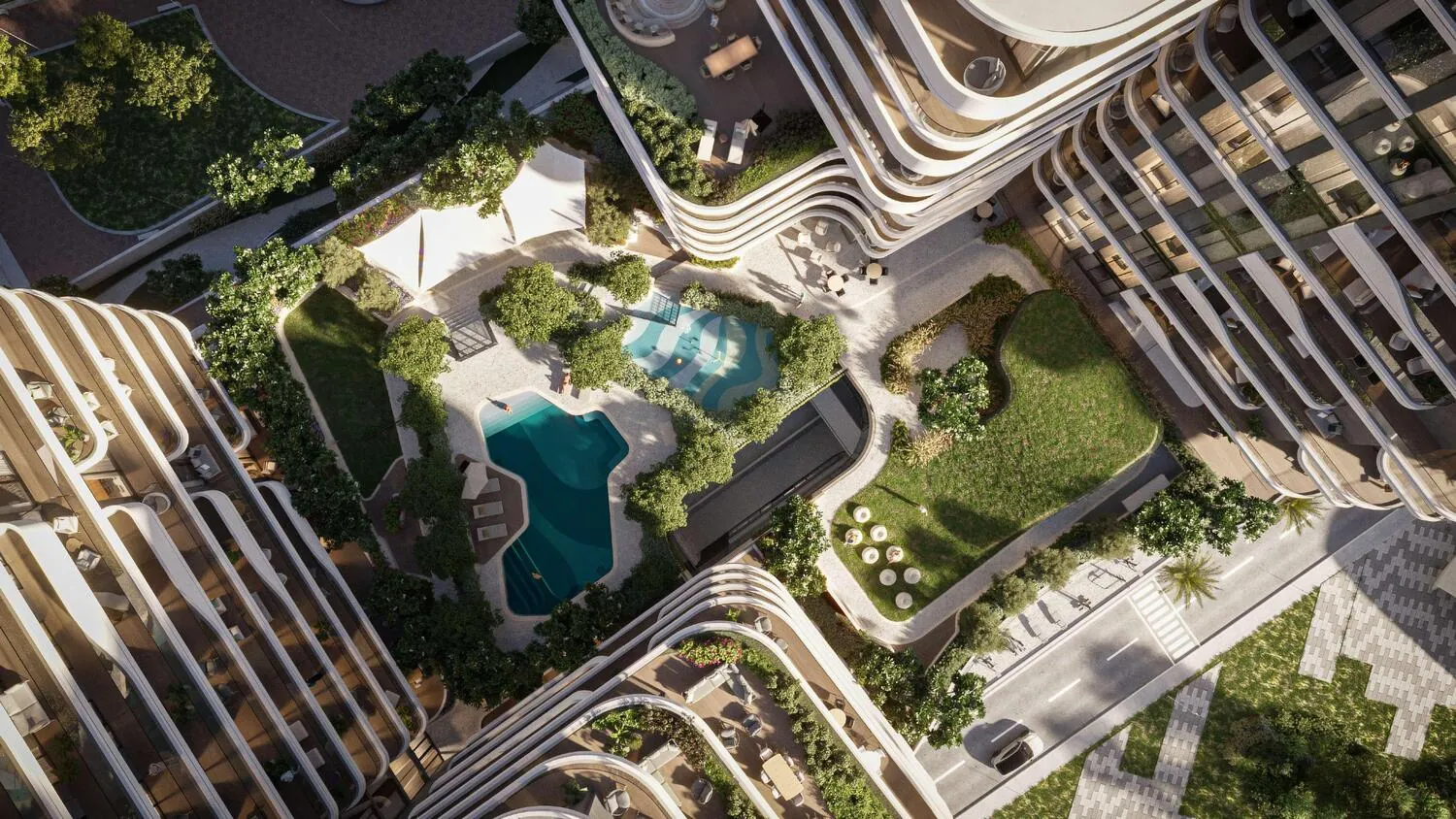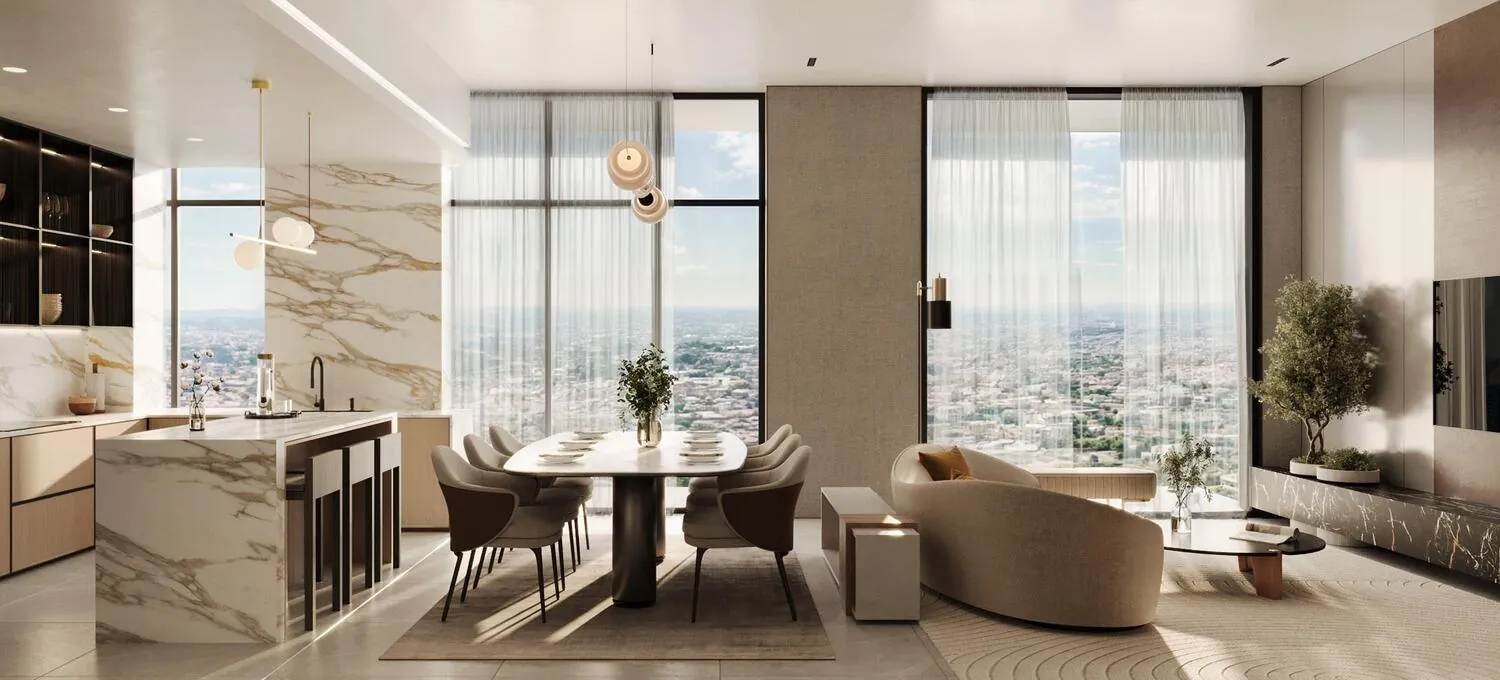 The development features residential units, offering a selection of 1-, 2-, and 3-bedroom apartments. Each home is crafted with a refined aesthetic, combining open layouts, light tones, and elegant finishes. Interiors blend functionality with comfort, highlighted by integrated living spaces, soft natural lighting, and high-end materials like marble and wood. Select apartments include study rooms, rooftop access, and design elements that emphasize both privacy and connection.