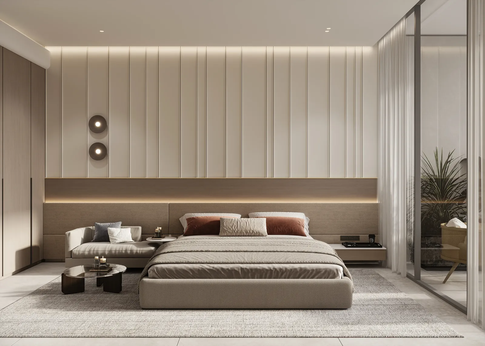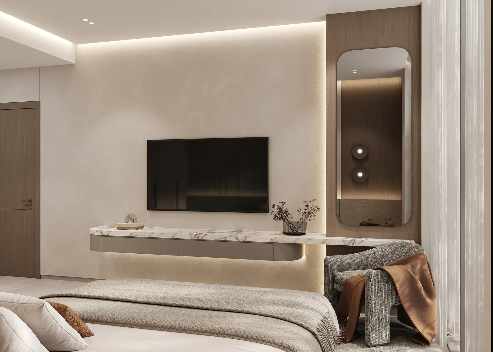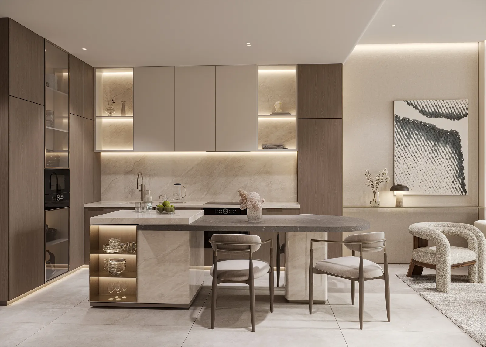 Inside, homes are shaped as tranquil retreats where natural stone, warm lighting, and soft textures come together in harmony. High ceilings and full-height windows bring in light and air, while smart-home systems and concierge services ensure effortless living. Kitchens open around sculpted marble islands, bathrooms mirror spa-like indulgence, and selected residences include private plunge pools — crafting an experience that feels both intimate and elevated.