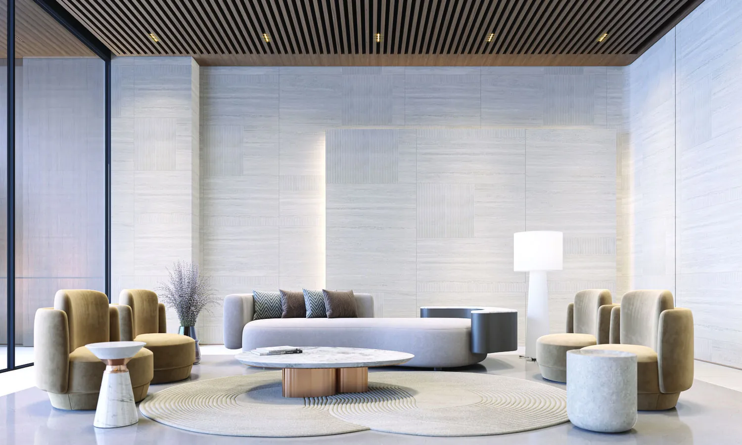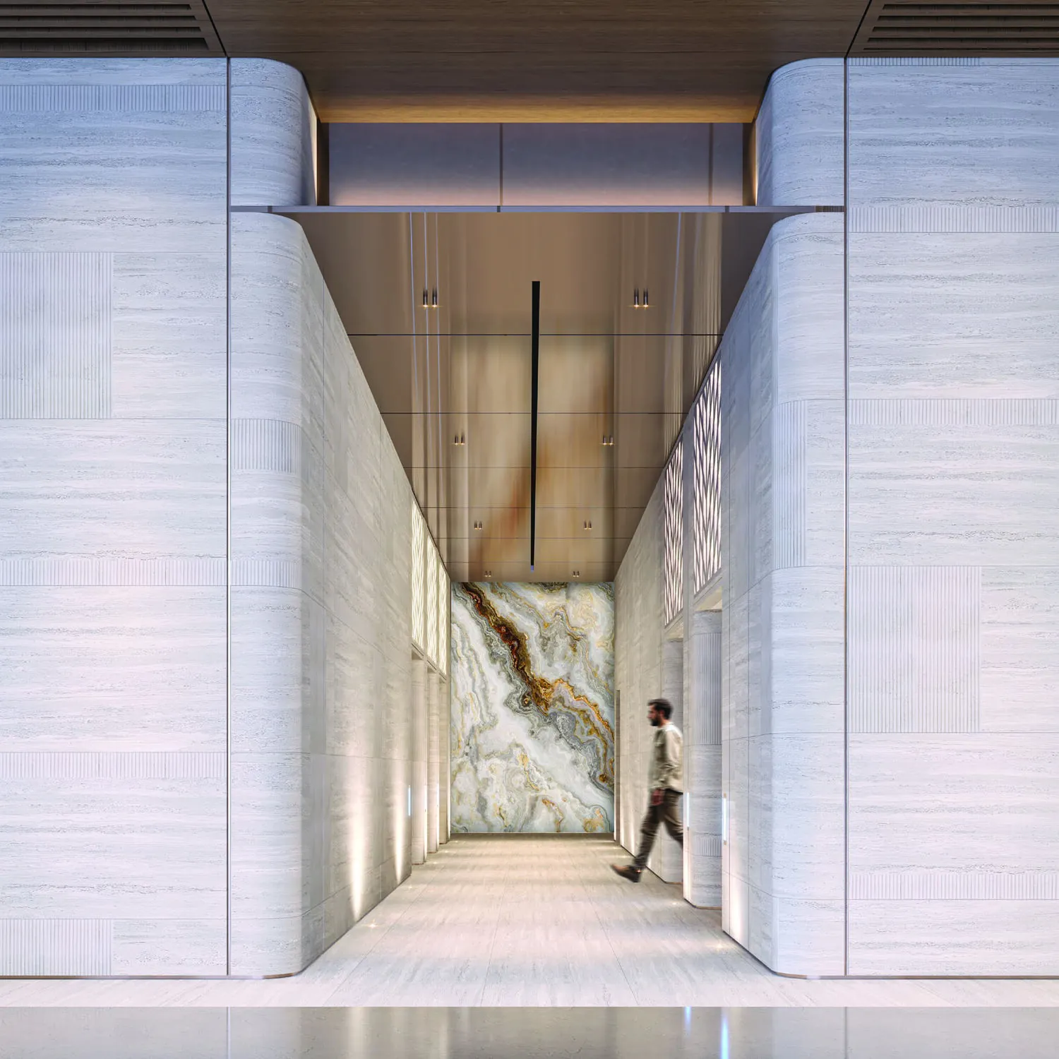 Walls are adorned with wood veneer, brown-tinted glass, and special white paint, complemented by elegant wall art in brown wood and bronze tones. The apartments feature flooring in crema marble and reflective marble with warm bronze and stainless steel accents, creating a harmonious blend of textures. Kitchens and bathrooms are crafted with travertine marble and luxury mixers.