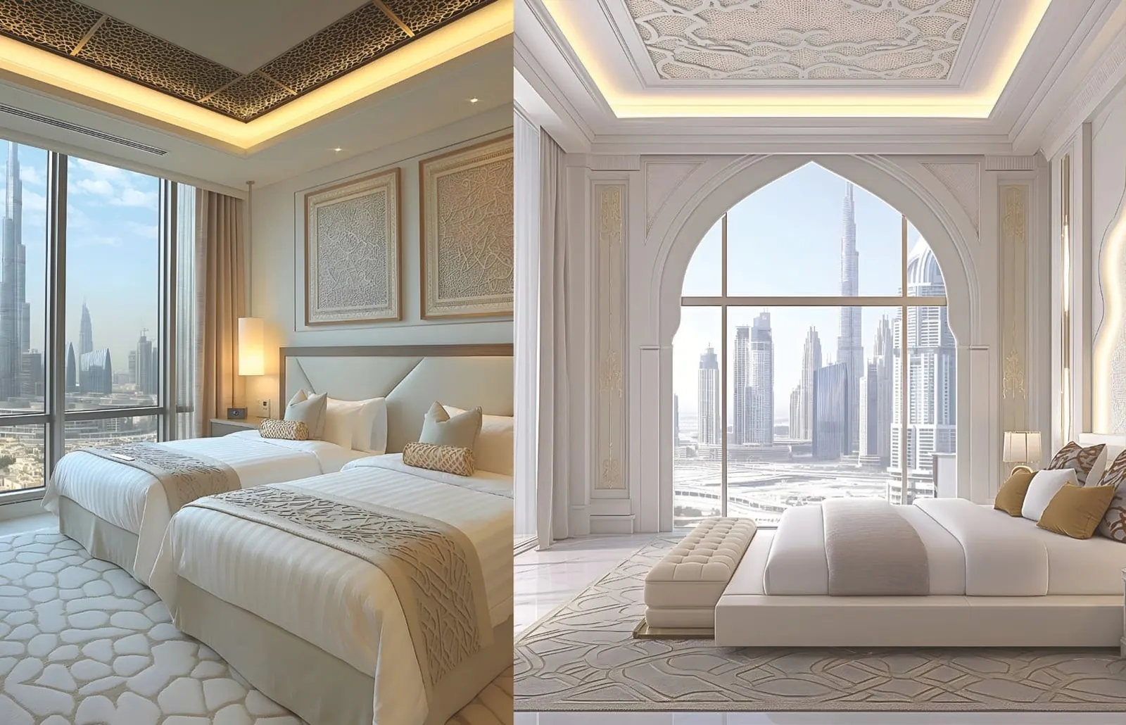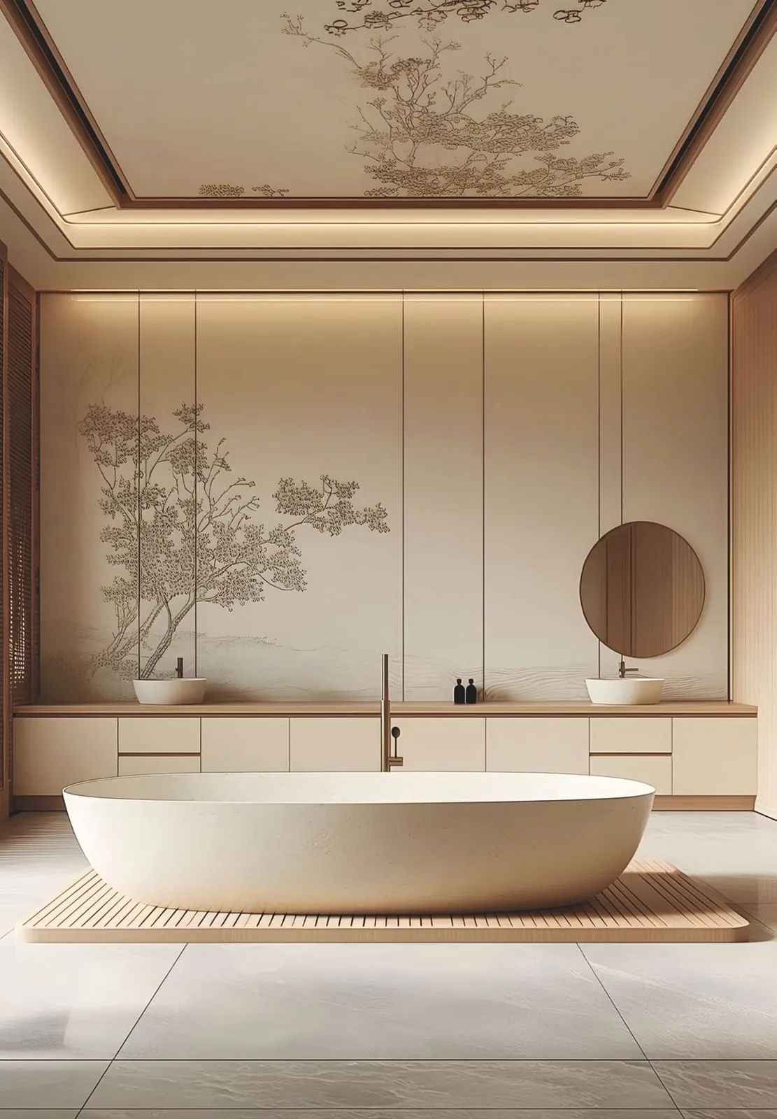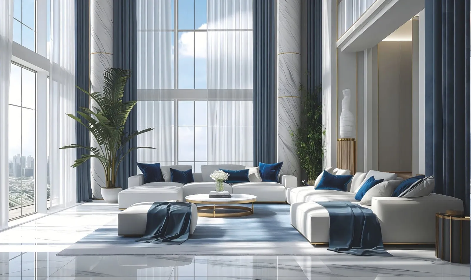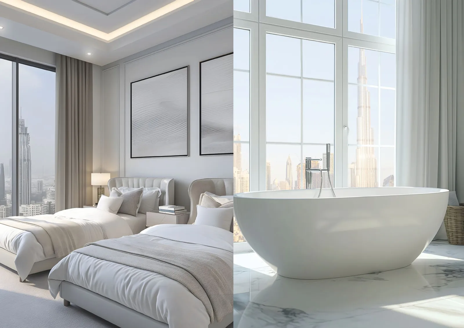 Modern finishing with high-quality materials. Light brown/tan fabric for furniture. White paint for walls and ceilings. Decorative luxury wallpaper with a white and beige pattern. Dark brown wood used for wall art. Light beige fabric for furniture. Light cream-colored marble for flooring