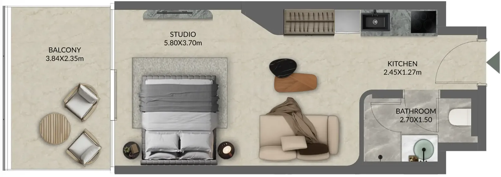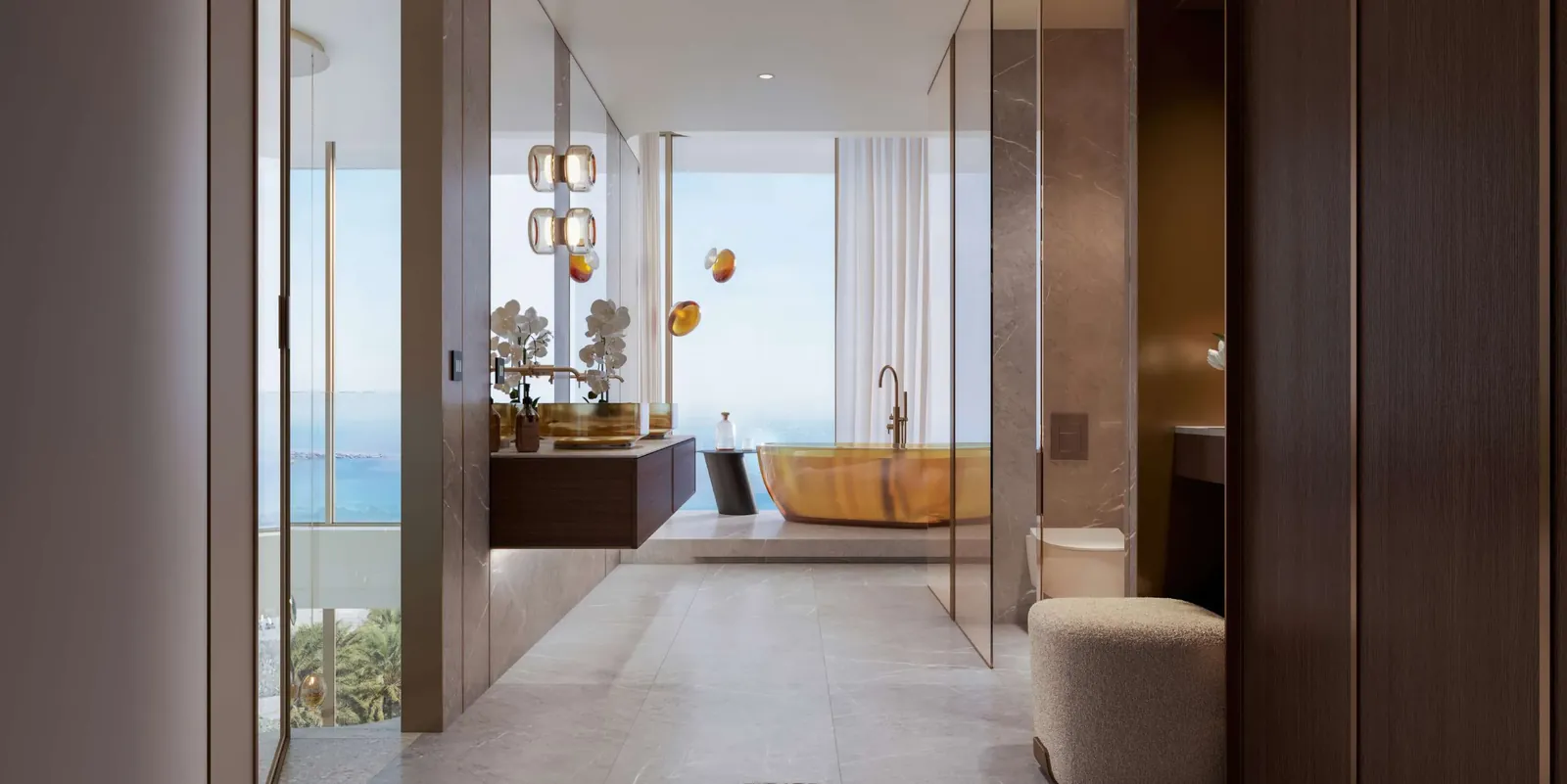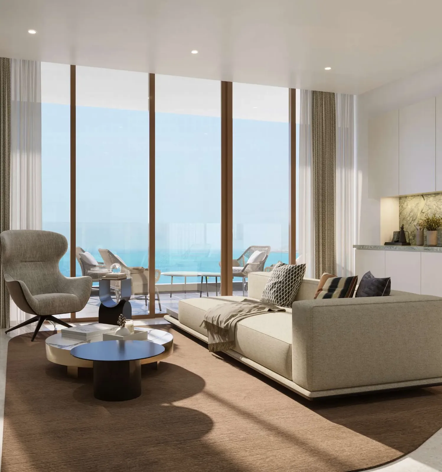 Inside, Palazzo Tissoli translates timeless craftsmanship into living form. Fully furnished studios and one-bedroom apartments reflect the balance between elegance and practicality — stone, wood, and glass form a warm, tactile palette, complemented by bespoke lighting and refined details. Floor-to-ceiling glazing dissolves the boundary between interior and exterior, framing the Arabian Gulf and the Wynn Resort as part of everyday life.