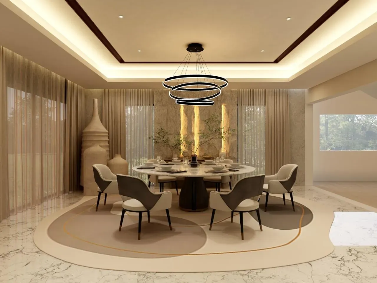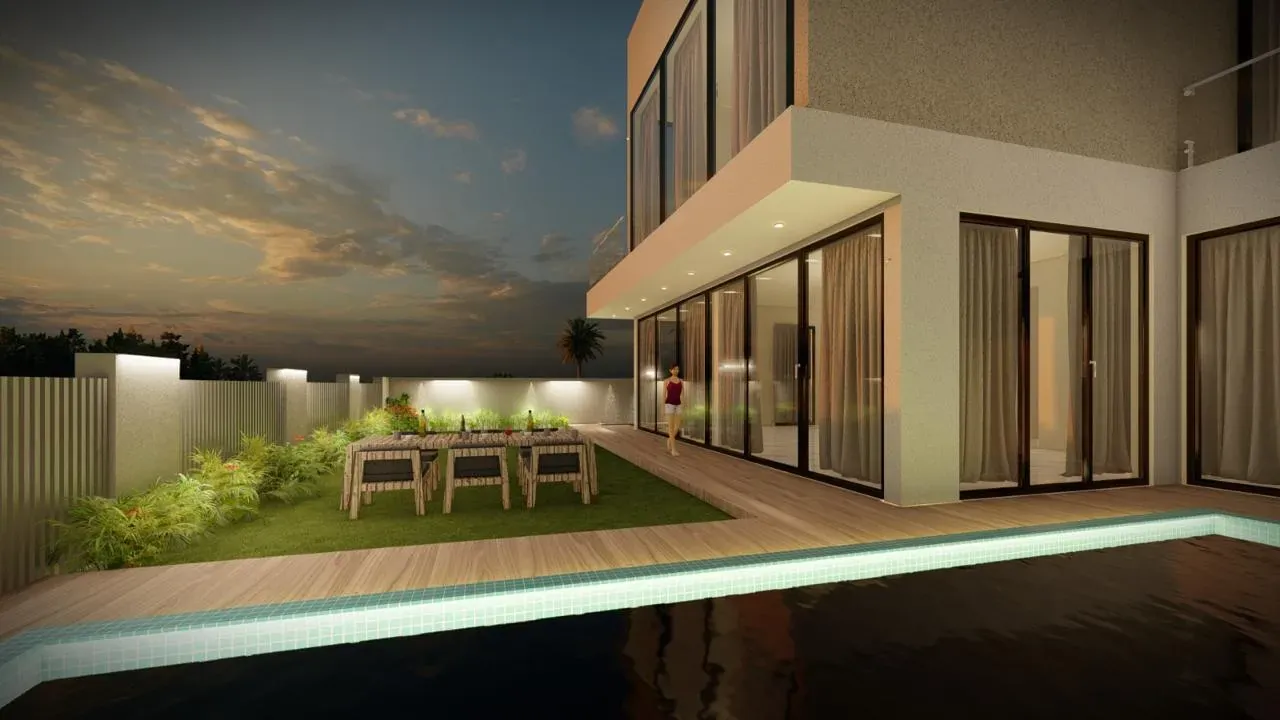 The villa’s interiors are finished in a warm, luxurious palette with marble-style flooring, soft ambient lighting, and refined decorative elements that enhance the sense of elegance throughout. The open kitchen features premium contemporary finishes with clean lines and integrated cabinetry. Textured wall panels, layered lighting, and neutral fabrics contribute to a calm, upscale atmosphere. The bedrooms and living spaces maintain the same modern aesthetic, with floor-length curtains, smooth surfaces, and a cohesive interior design language that blends harmony and sophistication.