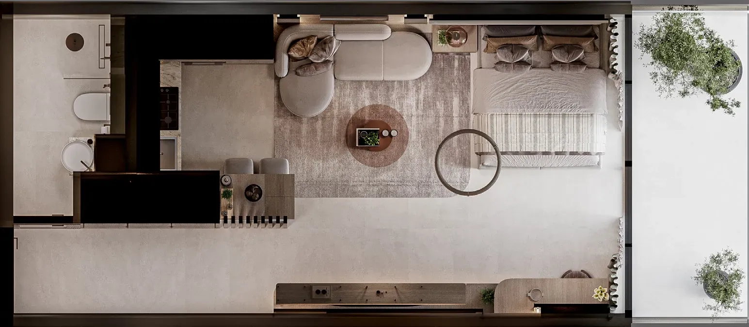 The homes at Cybele by Wadan come fully furnished, with integrated wellness features and premium materials. The project incorporates high-quality brands - Bosch, Laufen, UniFi, Amazon, and Bose - emphasizing refined finishes, modern functionality, and a move-in-ready lifestyle. Interiors use stone, soft timber, warm lighting, and clean architectural lines to establish a calm, elevated character throughout the building.